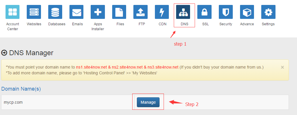 1. Login to your hosting control panel-->DNS from the top navigation, select the target domain and click "Manage" button beside it